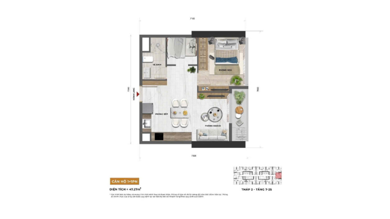 Căn hộ 1PN + 1 được bố trí theo phong cách mở – đa năng – đón sáng tối đa, mang lại cảm giác rộng rãi và thoáng đãng. Thiết kế tối ưu công năng sử dụng với các khu vực: