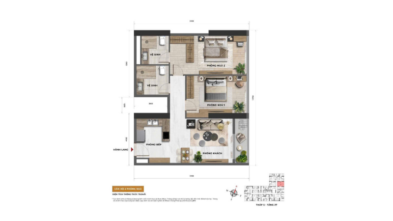 Tất cả các căn hộ 2PN đều được thiết kế với ban công thoáng, cửa sổ lớn, đảm bảo ánh sáng và gió tự nhiên luôn tràn ngập không gian sống. Mỗi căn đều có: